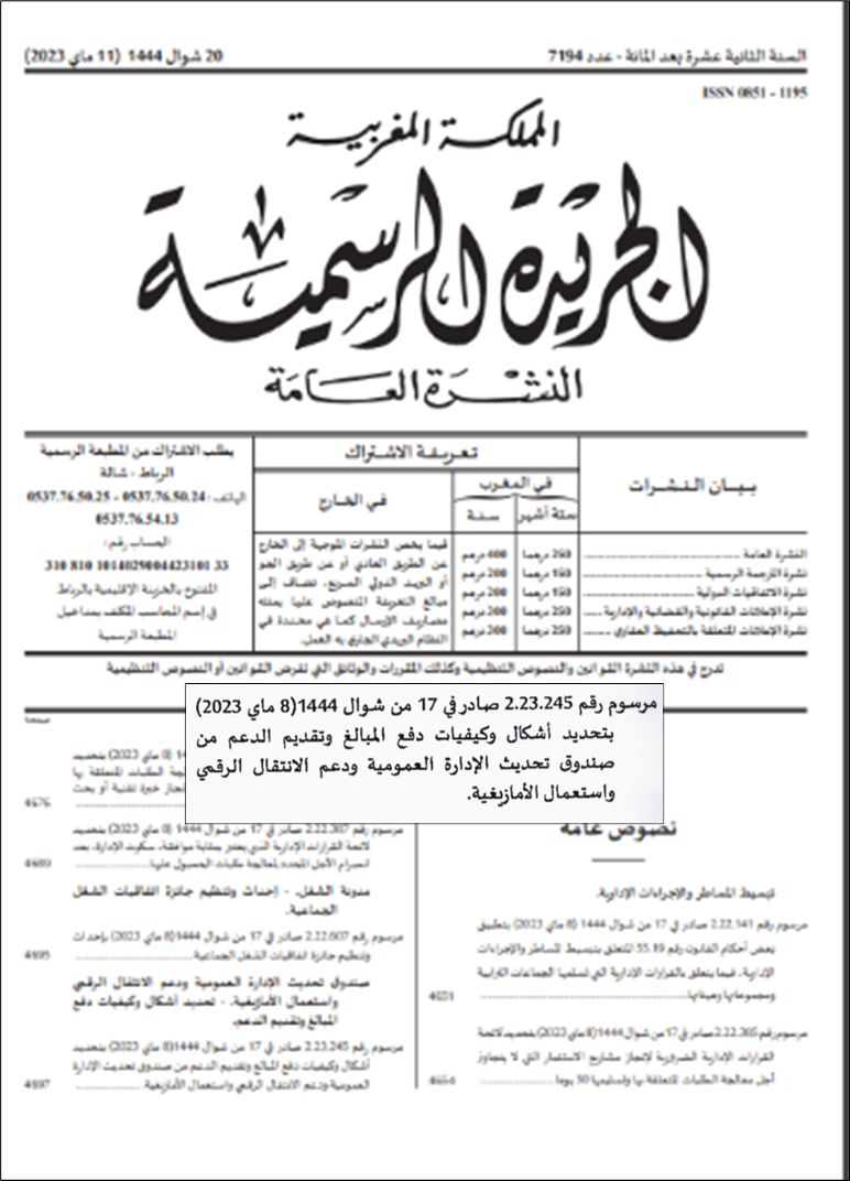 إصدار المرسوم رقم 2.23.245 الصادر في 17 شوال 1444 (8 ماي 2023) بتحديد أشكال وكيفيات دفع المبالغ وتقديم الدعم من صندوق تحديث الإدارة العمومية ودعم الانتقال الرقمي واستعمال الأمازيغية.